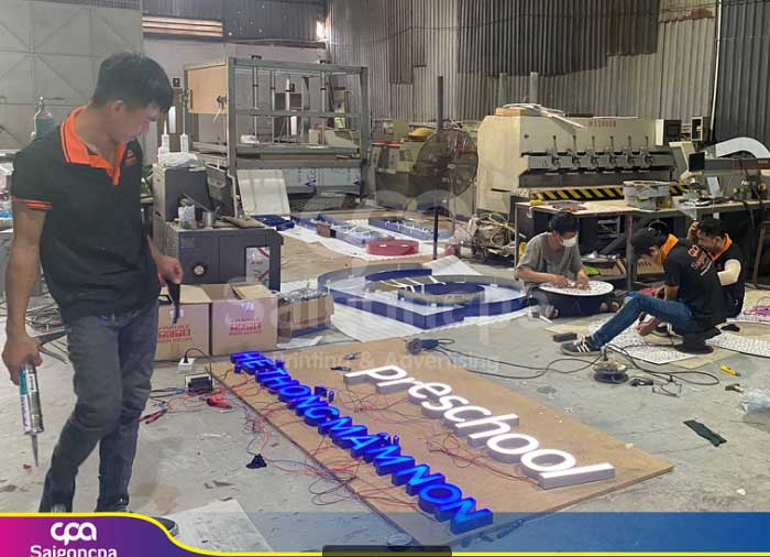 Bước 4: Lắp đặt chuyên nghiệp: Sử dụng bản vẽ định vị (decal/giấy) để đảm bảo chữ không bị lệch dù chỉ 1cm. Đi dây điện kín đáo, an toàn chống cháy nổ.